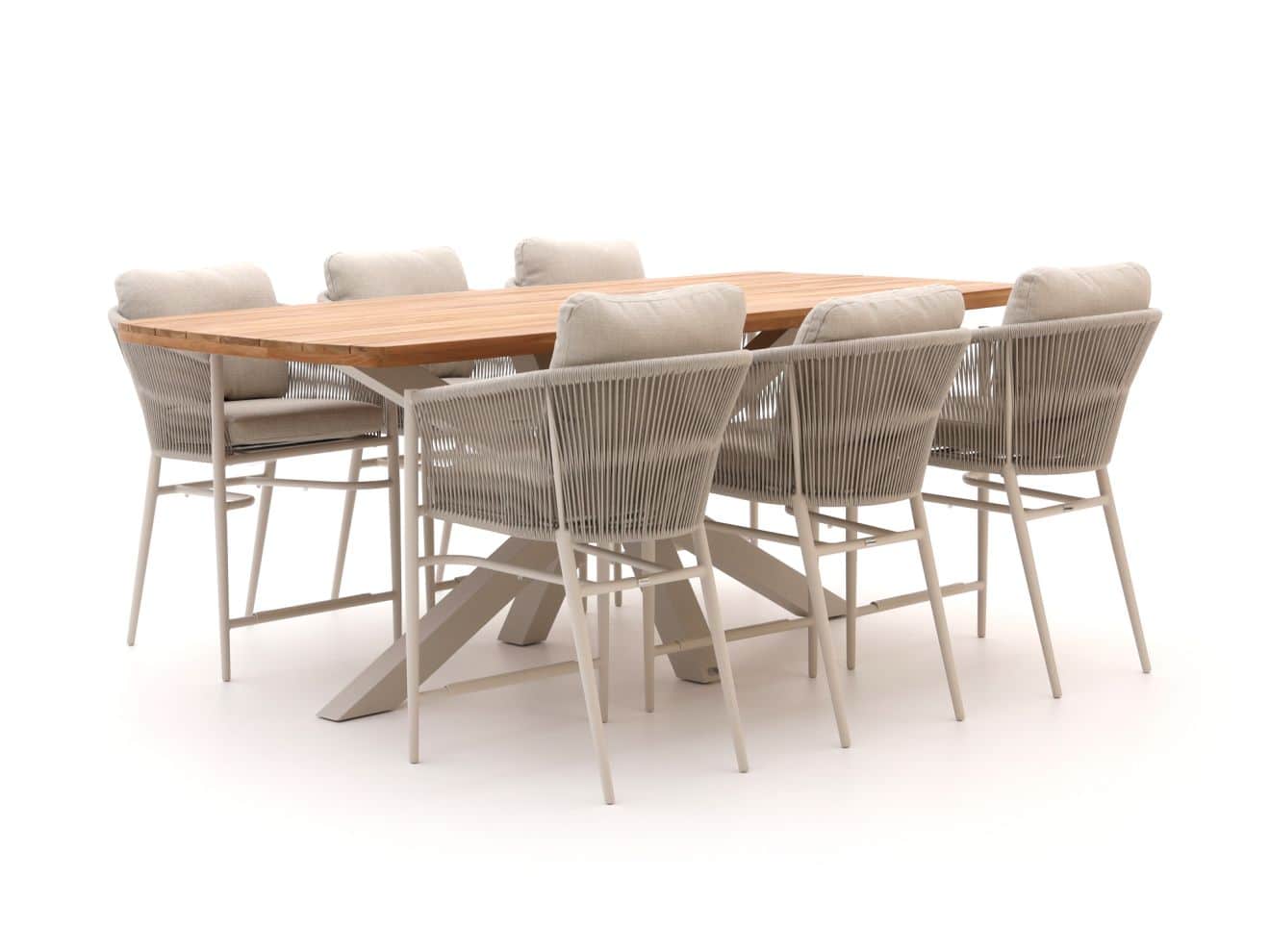 Der ovale Tisch mit 220 cm Länge bietet ausreichend Raum für sechs Personen. Das Set beinhaltet sieben Stühle, sodass ein zusätzlicher Sitzplatz flexibel genutzt werden kann.