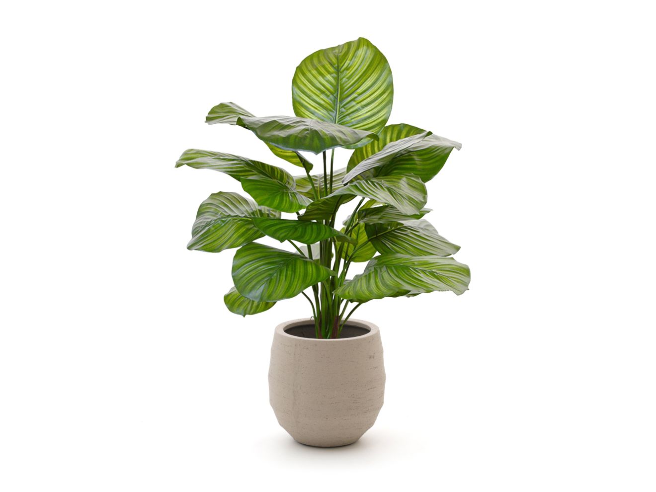Die Calathea Fasciata ist durch ihr detailreiches Blattmuster und die natürliche Farbgebung täuschend echt gestaltet. Die Verwendung hochwertiger Materialien sorgt dafür, dass sie auch aus der Nähe sehr authentisch wirkt.
