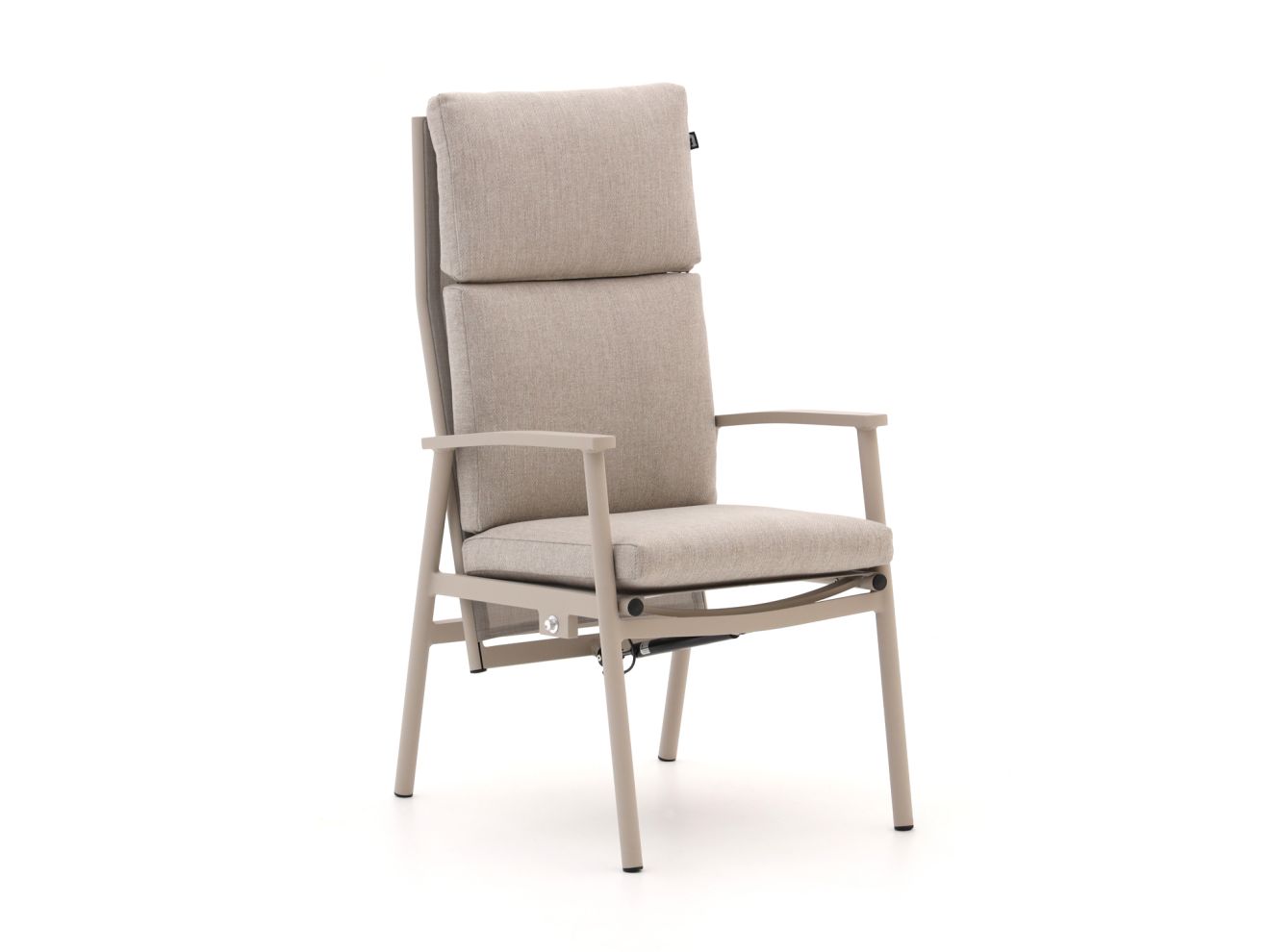 Der Hochlehner ist aus robustem, wetterfestem Aluminium gefertigt und mit einem hochwertigen Textilgewebe bespannt, das nicht nur atmungsaktiv, sondern auch pflegeleicht ist. Die ergonomisch geformte Rückenlehne ermöglicht ein entspanntes Sitzen über viele Stunden, während die Armlehnen das Gesamtbild abrunden und zusätzlichen Halt bieten.