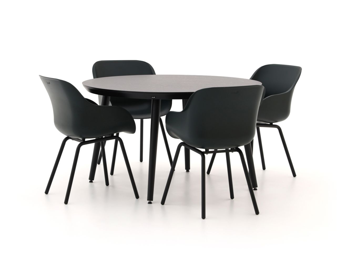 Das Set beinhaltet einen runden Tisch mit einem Durchmesser von 128 cm sowie vier bequeme Stühle. Die Kombination aus eleganten Linien und robusten Materialien sorgt für eine langlebige Nutzung und eine einladende Atmosphäre.