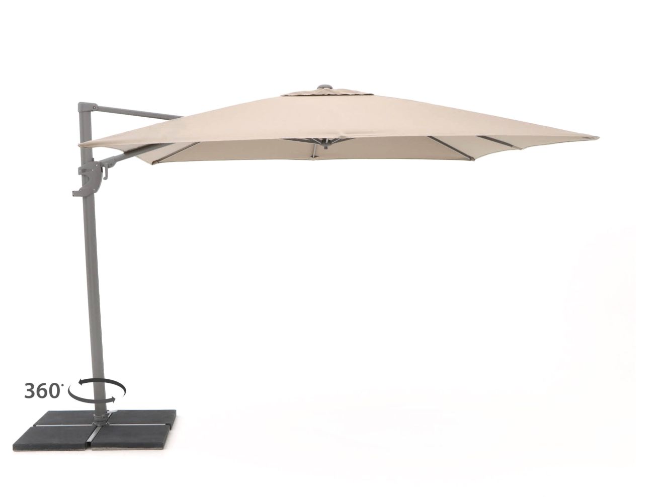 Der Schirm wird mittels einer praktischen Kurbel geöffnet und geschlossen. Die Drehfunktion am Schirmkopf erlaubt es, den Schatten flexibel an den Sonnenstand anzupassen, ohne den gesamten Schirm bewegen zu müssen.